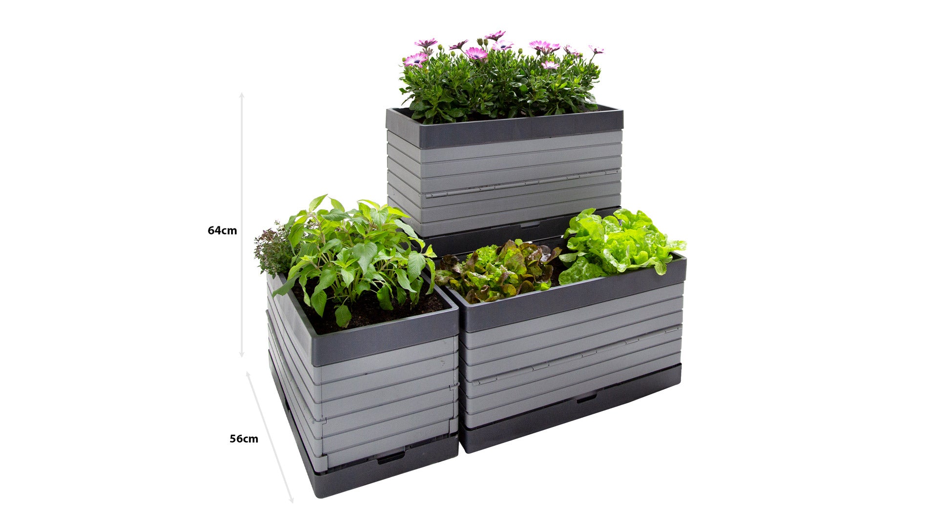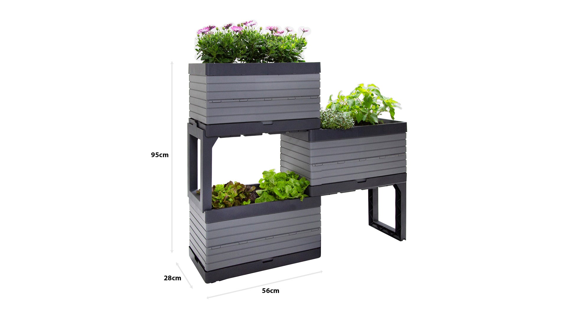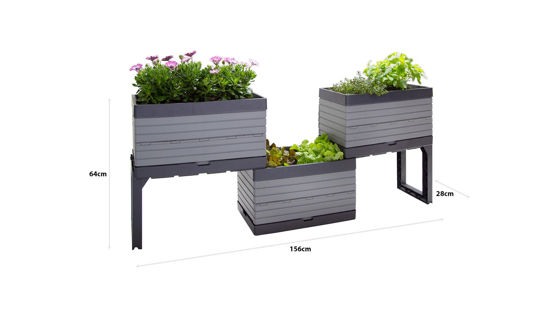 - Modular design allows for multiple configurations with 3 planters and 2 legs